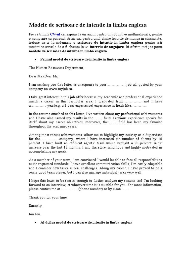 Modele De Scrisoare De Intentie In Limba Engleza Internship