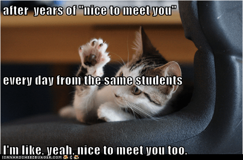 After Years Of Nice To Meet You Every Day From The Same Students I M Like Yeah Nice To Meet You Too Lolcats Lol Cat Memes Funny Cats