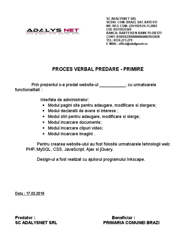 Proces Verbal De Predare Primire Documentatie