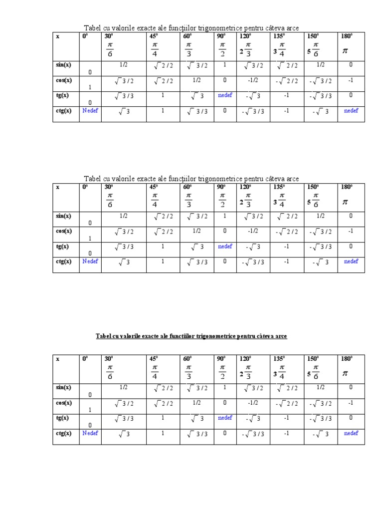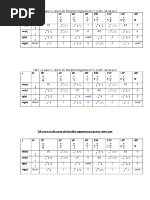 Tabel Cu Valorile Exacte Ale Funcţiilor Trigonometrice