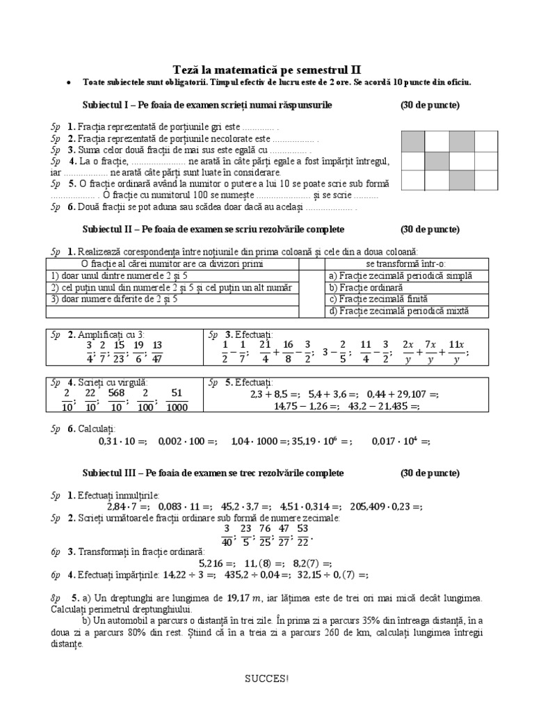 Teza Matematica Clasa 5 Sem 2 Varianta 3 Matematică Fracții